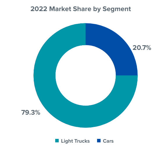 Light trucks (SUVs, CUVs, vans, pickups) continue to be popular. In 2022 light truck market share increased another 3.4 percent to 79.3 percent – breaking last year's record to be the highest in history. The upward trend in the popularity of light trucks over cars has been steady since 2013, when only 1.2 percent of market share separated the two segments; by the end of 2022, the divide has grown to 59 percent.