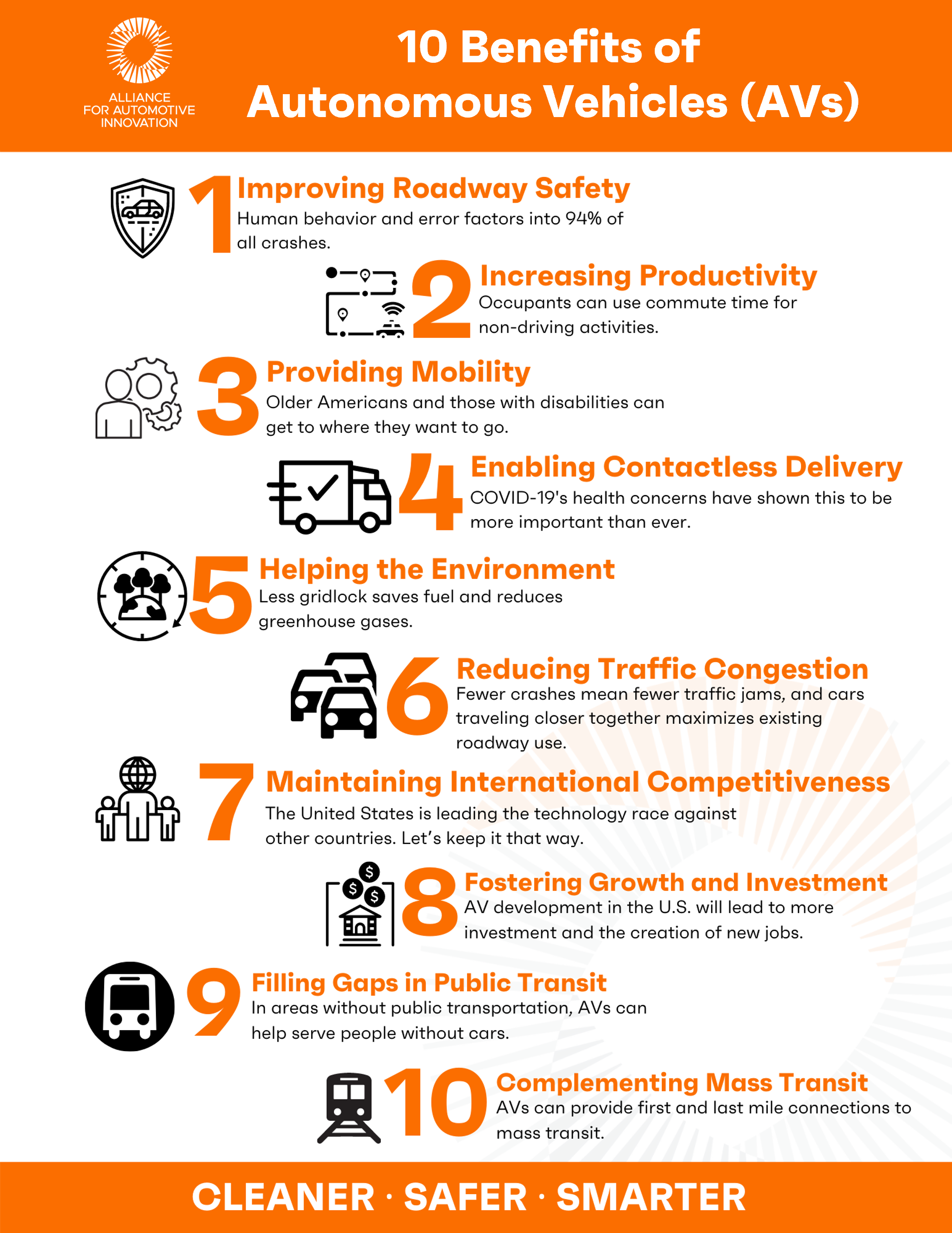 There are many benefits potential beneifts to automated vehicles, see 10 reasons why Congress should enact a comprehensive cutonomous vehicle (AV) Law.
